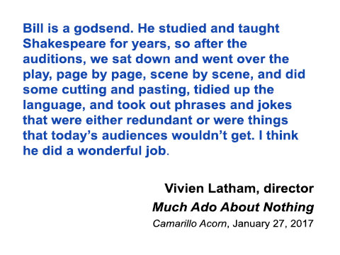 Bill can help you as a dramaturge, helping you bridge your production from the page to the stage, providing background information about past productions of your play, discussing of verse rhythm and word meaning with actors, as well as helping you edit your script to focus on your vision. Post-edit, he can also provide you with a chart showing which actors appear in which scenes (thus helping you multi-cast your production).